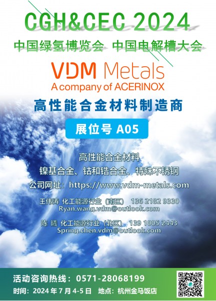 2024年7月4-5日,VDM Metals将亮相CGH2024 中国绿氢博览会&CEC2024 中国电解槽大会,欢迎莅临参观。VDM MetalsVDM Metals是全球领先的高性能合金材料制造商,是西班牙Acerinox集团的下属子公司之一。总部位于德国韦尔多尔,并在全球14个国家和地区设有分支和销 ...