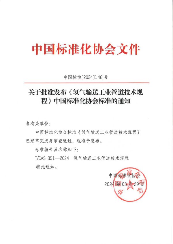 本标准规定了氢气输送工业管道的材料选择、设计和计算、施工和验收、运行与维护,于2021年6月获得立项批复,2023年7月完成征求意见稿,2023年11月末完成送审稿并顺利通过专家审查,由中国标准化协会于2024年3月正式发布。本标准的发布将推动整个氢能源领域的氢气输送工业管道的设计、制造、施工、检验、验收等工作走向规范化和标准化,进而促进我国各类氢能场站的建设发展。