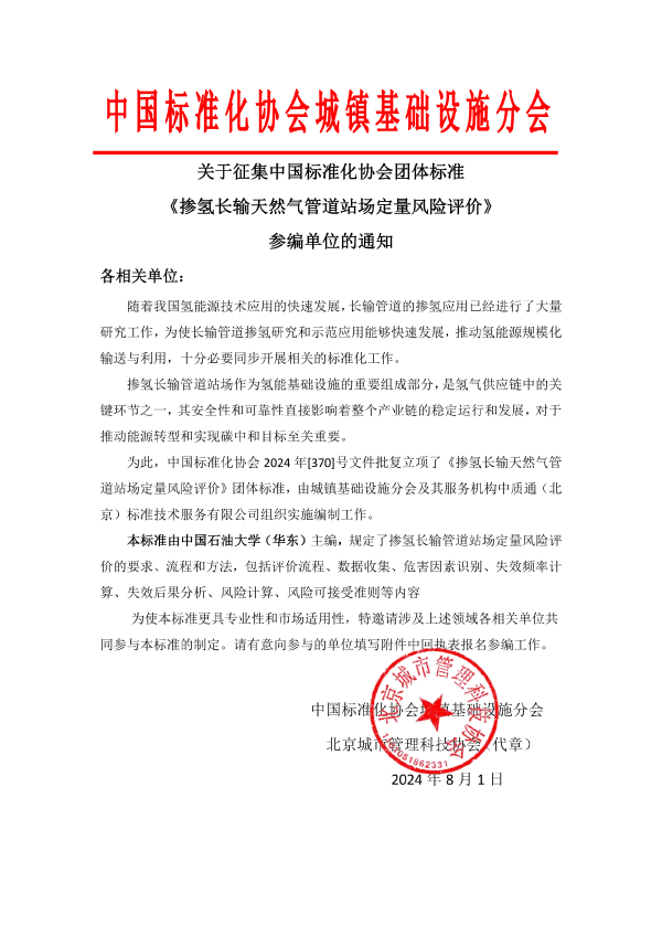 为此,中国标准化协会2024年[370]号文件批复立项了《掺氢长输天然气管道站场定量风险评价》团体标准,由城镇基础设施分会及其服务机构中质通(北京)标准技术服务有限公司组织实施编制工作。