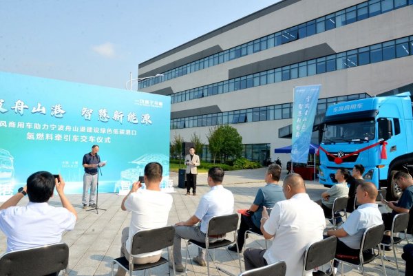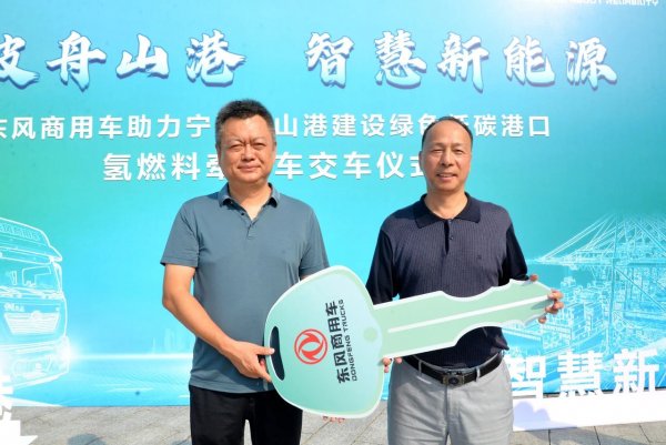 8月22日,东风商用车助力宁波舟山港建设绿色低碳港口氢燃料牵引车交车仪式在东风商用车品牌体验中心举行。10辆东风氢燃料牵引车钥匙,由东风商用车新事业领域总监黄绍军交付宁波舟山港集团技信部副主任冯华龙手中。
