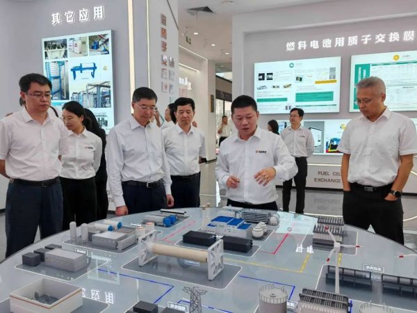 在公司董事长杨大伟的陪同下,喻宝才一行首先参观了公司展厅,认真听取杨大伟董事长关于公司发展历程、产品体系、应用场景及市占率情况的相关介绍;随后他走进公司研发中心和生产车间,详细了解质子膜的研发、生产、测试、应用等相关情况。