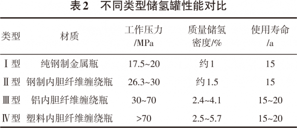 我国高压储氢气瓶及压缩机的研究起步较晚,目前美国PDC所掌握的氢气隔膜压缩机输出压力上限可达90MPa,并且其膜片与膜头均使用高镍材料,其安全性有了很大的提升。上海氢枫能源技术有限公司与豪顿华工程有限公司共同研发高性能隔膜压缩机输出压力上限超过45MPa,较国外还有很大的差距。并且由于碳纤维的材料性能与纤维缠绕加工等技术的限制,目前普遍使用可自行生产的一般以铝合金为内胆,树脂基复合材料为外表面的压力标准为35Mpa的Ⅲ型钢瓶,一些国内科技公司,如北京天海工业有限公司已经完成70MPa产品试制工作,中集安瑞科控股有限公司也已完成了多款Ⅳ型瓶产品的研发制造,取得了突破性的进步。国外发达国家公司,如美国Quantum、日本丰田TOYOTA、挪威Hexagon等对压力标准为70MPa的Ⅳ型瓶的研发与应用已经相当成熟。Ⅳ型瓶相比与Ⅲ型瓶只有瓶口为金属材料,内胆为非金属塑料,所以质量更轻,储氢密度更大,并且可以缓解高压下发生的氢脆现象。如表2所示对四种不同类型储氢罐的材质、工作压力、储氢密度、使用寿命作了对比[5]。