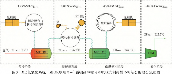 低温液态储氢即将氢气冷却到-253℃进行液化,然后将其储存在低温绝热容器中的一种储氢技术。由于液氢的密度是标准状况下氢气密度的近850倍,所以低温液态储氢在单位储氢量上相比高压气态储氢具有很大的优势。但液氢的沸点极低,将其液化所需要的能量极大,这就对储罐材料的绝热性能有着极高的要求。由于液氢与液氧配对时所产生的高比冲[11],这种储氢技术适用于长距离储运,比如用作航空运载火箭的燃料或低温推进剂。图3是一种新的吸附式制冷系统的氢液化流程,该系统主要包括三个阶段,分别为预冷阶段、低温制冷阶段、液化阶段,在预冷阶段将氢气从25℃预冷到-196.2℃,在液化阶段将氢气从-196.2℃冷却至-249.3℃[12]。