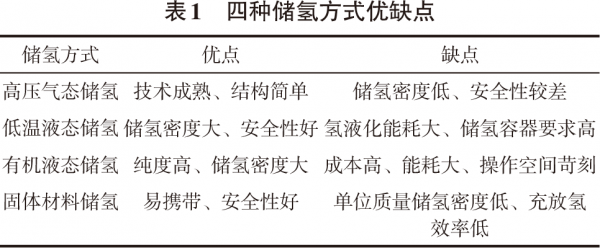 目前储氢方式主要分为四类,分别为高压气态储氢、低温液态储氢、有机液态储氢、固体材料储氢。这四种储氢方式的优缺点如表1所示。