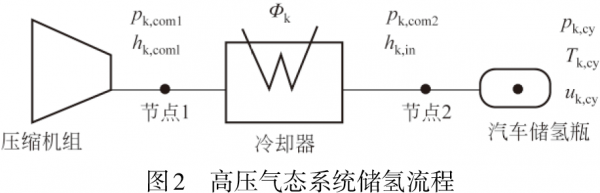 高压气态储存技术是目前我国最常用的储氢技术,技术设备较为完善。高压气态储氢是把氢气压缩,将其储存在耐压罐里的一种技术,其储氢量与压力成正比。高压气态系统储氢流程如图2所示,氢气在压缩机组加压冷却后进入冷却器进一步冷却至充入温度,最后充入储氢瓶[4]。