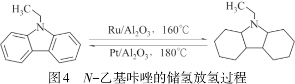 Kim等[19]报道了一种高活性Ru/MgO催化剂,与Ru催化剂相比,该催化剂表现出更快的H2存储速率和更加优异的动力学参数,可以在低温下将氢快速储存到芳香族化合物中。随着技术的不断发展,人们发现通过在环状烯烃中引入杂原子[20],可以有效的提高材料的加氢/脱氢性能,其中,N原子的引入对其脱氢性能的提升较大。例如N-乙基咔唑体积储氢密度和质量储氢密度可达到55g/L和5.8%(质量分数,余同),图4为该材料的储氢放氢过程[21]。Yu等[22]利用LaNi5作为N-乙基咔唑的催化剂,在453K的条件下,4.5h内的储氢容量可达5.5%而脱氢仅需要4.0h,大大降低了吸放氢温度,缩短了吸放氢时间。Yang等[23]开发了Pd/Al2O3-YH3钯催化剂,使用该催化剂,N-乙基咔唑可以在低于473K的情况下在4h内可逆地储存5.5%的氢气。Wang等[24]发现使用铱基催化剂还可以促进N-杂环脱氢的逆反应,加快脱氢速率。