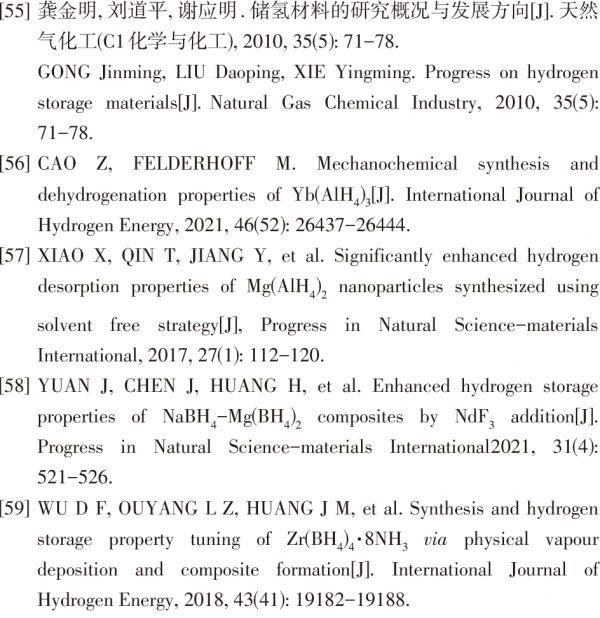 该种储氢材料与上节储氢材料之间的主要区别在于吸氢过程,金属基储氢合金材料中的氢以原子状态储存于合金中,而该材料中的氢以离子或共价化合物的形式储存于材料中[55]。该种材料具有极高的储氢容量,并且其中的LiBH4、NaBH4和KBH4已实现了工业化生产,由于铝氢化物、硼氢化物具有较高的储氢密度,所以这两类的配位氢化物是近些年研究的热点。