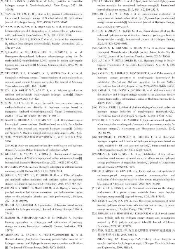碳基储氢材料的价格相对其他固体材料来说较为便宜,且原材料获取容易,但储氢密度相对较低。目前来看,制约碳基材料的金属团聚、将碳基材料微孔化所能提高的储氢密度相对较高,所以,微孔化以及寻找新的可制约碳基材料金属团聚的元素是未来的一大研究热点。将改性、调节比表面积、孔道尺寸、孔体积、微孔化、制约碳基材料金属团聚等方式相互结合极有可能会获得更高的储氢密度。