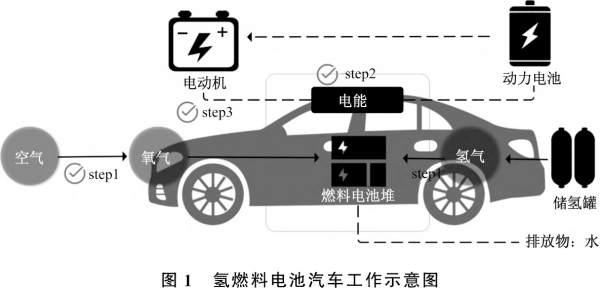 燃料电池是将储存在燃料和氧化剂中的化学能直接转化为电能的发电装置。目前,燃料电池技术的应用大致可以分为3个方向,分别有用于移动的便携式燃料电池,包括辅助动力装置(APU)、为固定位置提供动力的固定式动力燃料电池,以及为车辆提供主要推进或增程能力的运输燃料电池。氢燃料电池汽车在《国家创新驱动发展战略纲要》《中国制造2025》《汽车产业中长期发展规划》等重要战略纲要中,均被列为要大力发展的产业。氢燃料电池车主要由燃料电池系统(包含反应堆、空气压缩机等)、储氢装置、辅助电池、控制装置和驱动电机构成。氢燃料电池汽车依靠电能来驱动汽车发动机,这种能量主要来自氢燃料电池。与其他类型的燃料电池相比,质子交换膜燃料电池(PEMFC)更适合氢燃料电池汽车,因为它在60~80℃下运行时具有高功率密度和低腐蚀的优势[7]。氢燃料电池与传统电池的不同之处在于它们不是储能装置。更准确地说,它们接收氧气和氢气,并迅速将其转化为能量和水[8]。氢燃料电池的理论效率为83%,实际效率可以达到60%~70%。Xiong等[9]证明,氢燃料电池动力叉车的工作效率比锂电池动力叉车高40.6%。氢燃料电池汽车的工作示意图如图1所示,电极仅作为化学反应的场所和导电通道,不参与化学反应。氢燃料电池的燃料是氢和氧,产品是洁净的水,无CO和CO2,无硫和颗粒废气的完美化学反应结果。