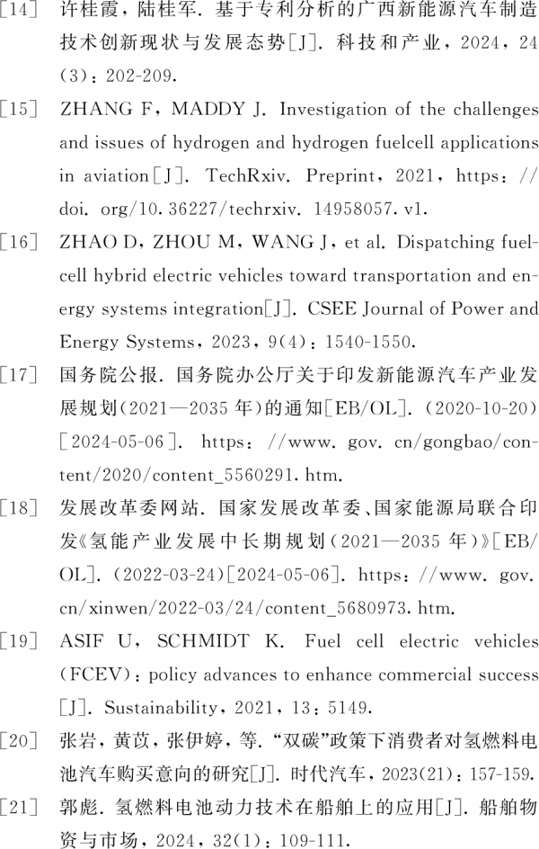 国内关于氢燃料电池及其相关应用的研究呈逐年上升趋势。刘超等[12]对氢燃料电池在集装箱码头的设备应用上进行了可行性分析,重点分析其在集装箱水平运输设备上的应用,并对比了与柴油机、充电式锂电池等动力设备的区别,认为氢燃料电池在此场景具有可行性与优势。李可和郭哲辉[13]对氢动力技术在交通领域的应用场景、中国氢能的相关政策引导和城市发展、氢动力技术主要技术路线进行了分析,介绍其在物流、港口运输、城际货运、矿石和渣土运输等方面的应用。许桂霞和陆桂军[14]在对广西新能源汽车制造技术和发展的研究中发现,制车已进入发展快车道,但全产业链体系尚未形成。在国外现有研究中,有较多关于氢燃料电池制造、储运、技术工艺改进等环节的专业性研究。Zhang和Maddy[15]研究了氢和氢燃料电池在航空领域应用的挑战和问题,为了减少航空业的碳排放,需要更多的电动飞机投入使用。氢和燃料电池系统创造清洁道路运输的能力已经得到了广泛的测试,可用于监视、通信、交付和无人机运输等场景。Zhao等[16]提出了跨能源系统的混合动力电动汽车也是一种对氢燃料及其动力技术应用的模式,可以作为传统燃料汽车向可再生能源过渡的一种形式。国内外关于氢燃料电池的研究集中在综述、技术突破、应用趋势等范畴,关于物流运输上的应用主要体现在一些固定场景,如重卡运输、船舶运输等,较少有研究就氢燃料电池在物流运输领域的应用进行全面的分析和探讨。
