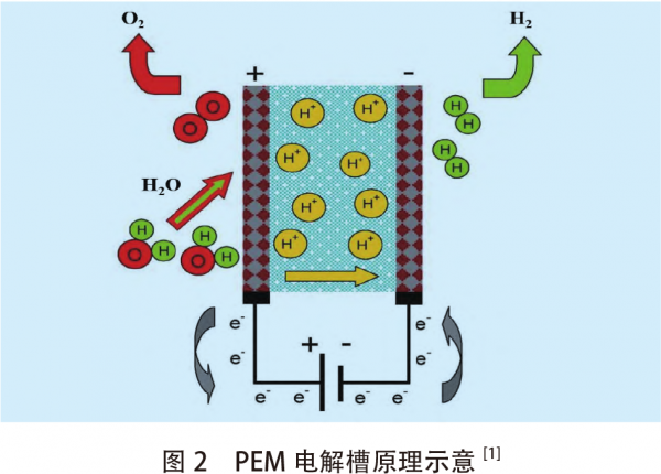 1966年美国通用电气公司开发了基于质子传导概念的水电解槽,采用聚合物膜作电解质。1978年通用电气公司将PEM电解槽商业化。目前,公司生产的PEM电解槽较少,主要是因为其产氢量有限、寿命短及投资成本较高。PEM电解槽采用双极结构,电池之间的电气连接通过双极板进行,双极板在排出产生气体方面起重要作用。阳极、阴极和膜组构成膜电极组件(MEA),电极通常由铂或铱等贵金属组成。在阳极,水被氧化产生氧气、电子和质子。在阴极,阳极产生的氧气、电子和质子通过膜循环到阴极,被还原产生氢气。PEM电解槽的原理如图2所示。