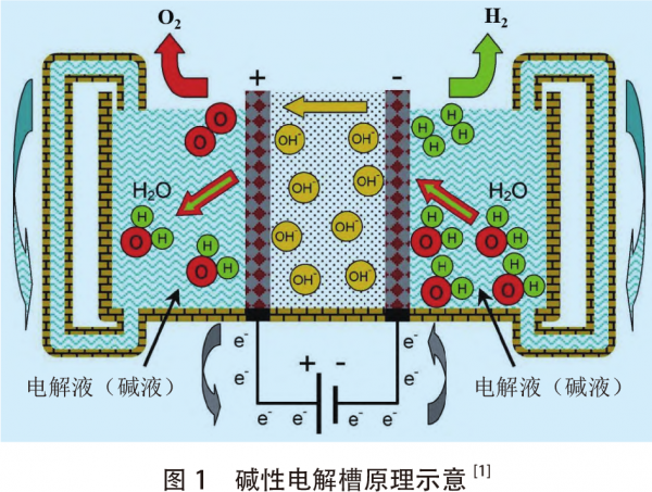 碱性电解槽的工作原理如图1所示。电池由两个电极组成,两个电极由气密隔膜分开。电池装配时浸没在高浓度的碱性液体电解质KOH(20%~30%)中,使离子电导率最大化,NaOH和NaCl溶液也可作电解液,但不常用,电解液的主要缺点是具有腐蚀性。电解槽的工作温度为65~100℃,电解槽阴极产生氢气,生成的OH-通过隔膜流向阳极,在阳极表面重新结合产生氧气。