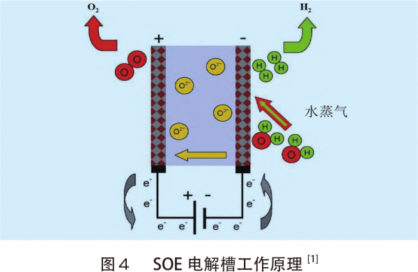 固体氧化物电解槽(SOE)利用高温水蒸气(600~900℃)电解,效率高于碱性电解槽和PEM电解槽。20世纪60年代,美国和德国就开始进行SOE高温水蒸气的相关研究。SOE电解槽的工作原理如图4所示。循环氢气和水蒸气从阳极进入反应系统,水蒸气在阴极电解成氢气,阴极产生的O2-通过固体电解质移动到阳极,重新结合形成氧气并释放电子。