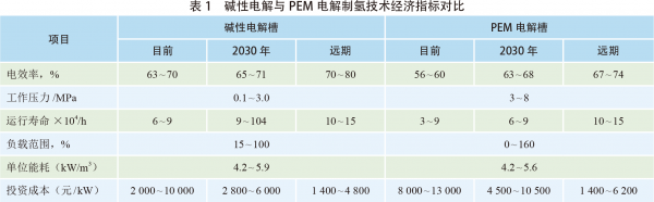 我国以可再生能源(如风电、光伏、水电)进行电解水制氢,电价控制在0.25元/kWh以下时,制氢成本具有相对经济性(15.3~20.9元/kg)。碱性电解与PEM电解制氢技术经济指标见表1。