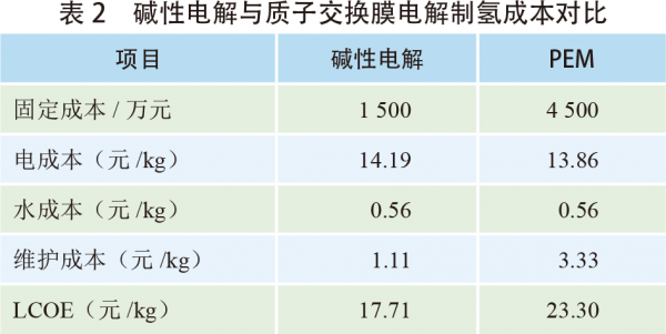 以碱性电解和PEM电解项目(1000Nm³/h)为例,假设项目全生命周期为20年,运行寿命9×104h,固定成本包裹电解槽、氢气纯化装置、材料费、土建费、安装服务费等项目,电解以0.3元/kWh计算,成本对比见表2。