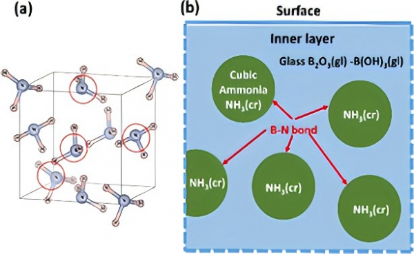 1、在室温和常压下稳定固体氨:如果氨固体颗粒(NH3(cr))可以被捕获在硼酸玻璃基体(B2O3(gl)-B(OH)3(gl))中,则可以在硼(B)和氮(N)之间的界面形成强B-N键,即使在室温下通常为气态的固体也可能稳定。为了将氨固体封装在这种玻璃基体中,采用了通常用于食品保存的冷冻干燥方法。最初,氧化硼(B2O3)溶解在氨溶液中,使氨转化为铵离子,氧化硼转化为硼酸盐离子。然后将该溶液冷冻在液氮(-196°C)中,抽真空以浓缩这些离子,将氨固体颗粒捕获在硼酸玻璃基体中。这种冷冻氨在52°C时保持稳定,保持其固体形态。换句话说,我们成功地将氨气的升华温度提高了130℃。x射线衍射和拉曼光谱证实,被困在玻璃基体中的氨颗粒在室温下仍保持固体状态。
